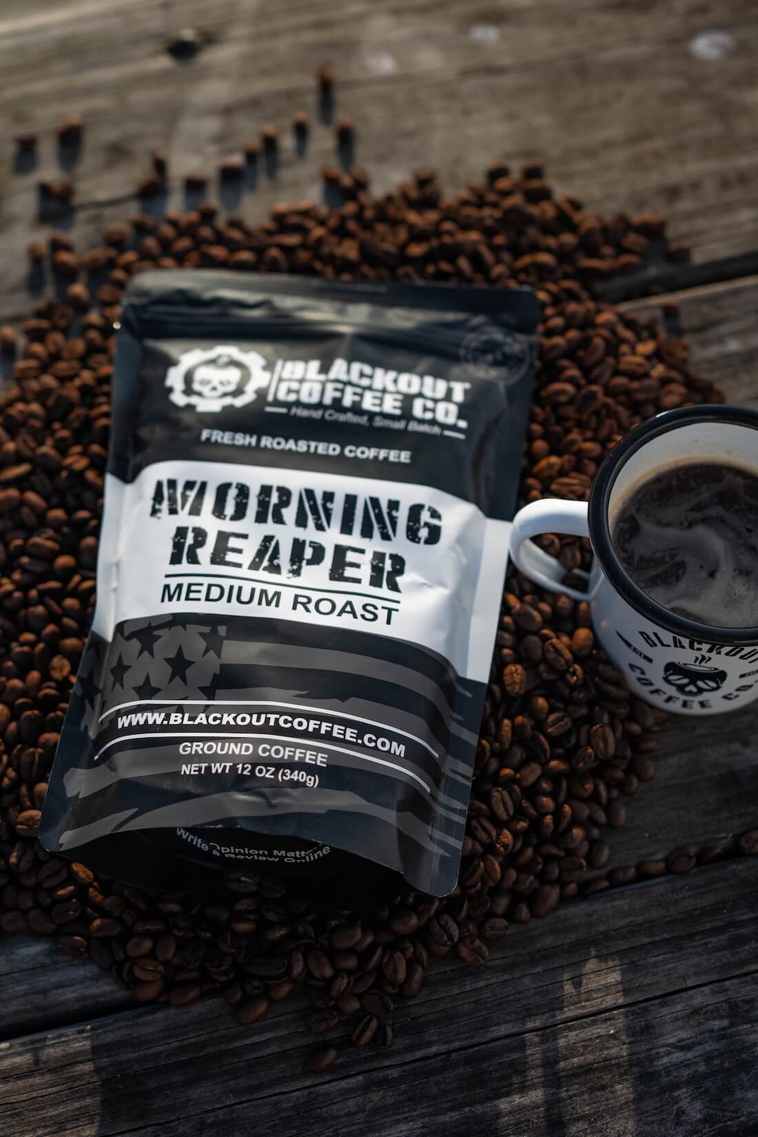 Colored American Flag on one side and Black/White Blackout Coffee Skull logo on the other (and bottom).