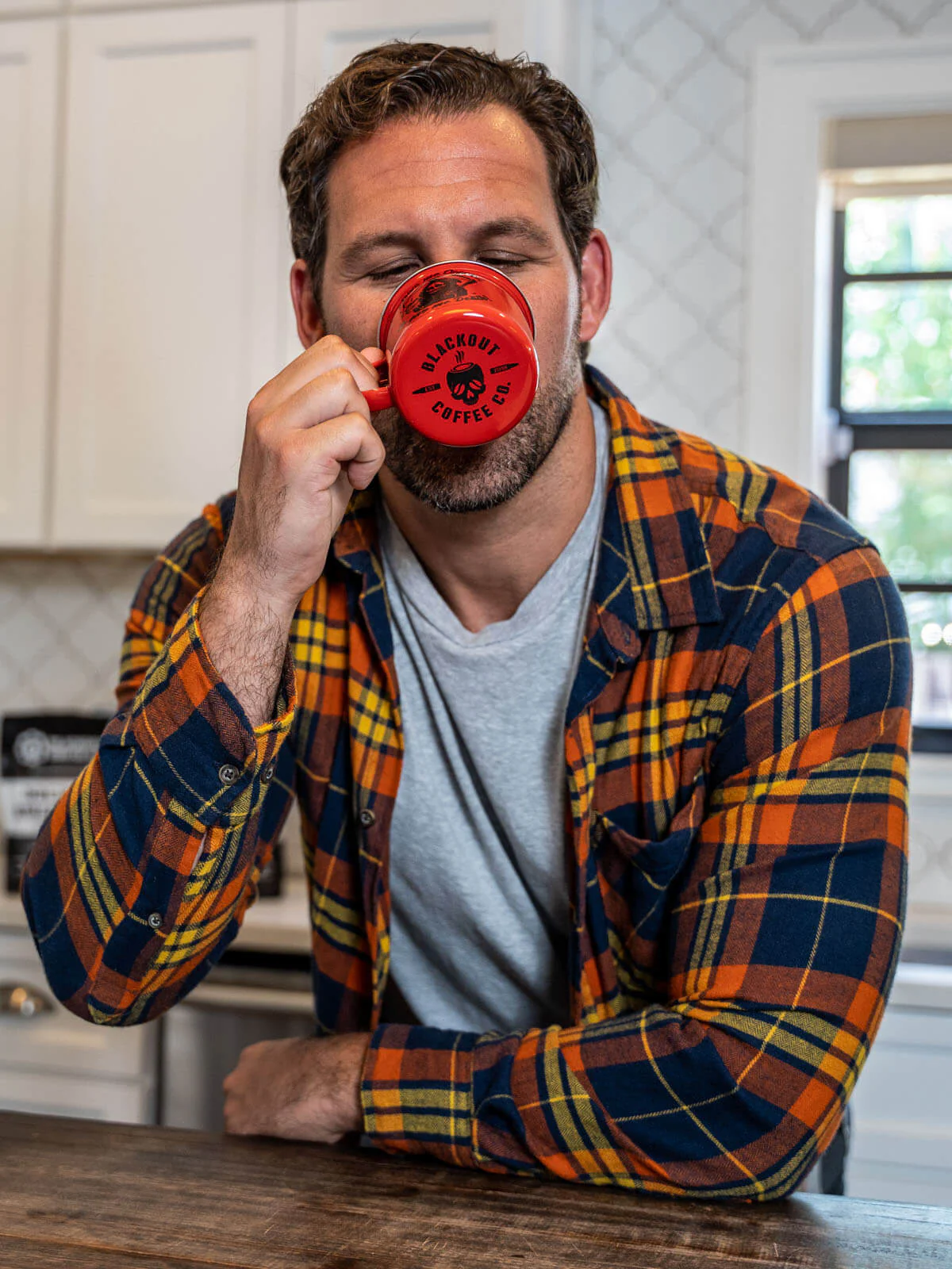 GIVE ME COFFEE OR GIVE ME DEATHĀ on one side. American Flag on the other and Blackout Coffee logoĀ inĀ bottom.